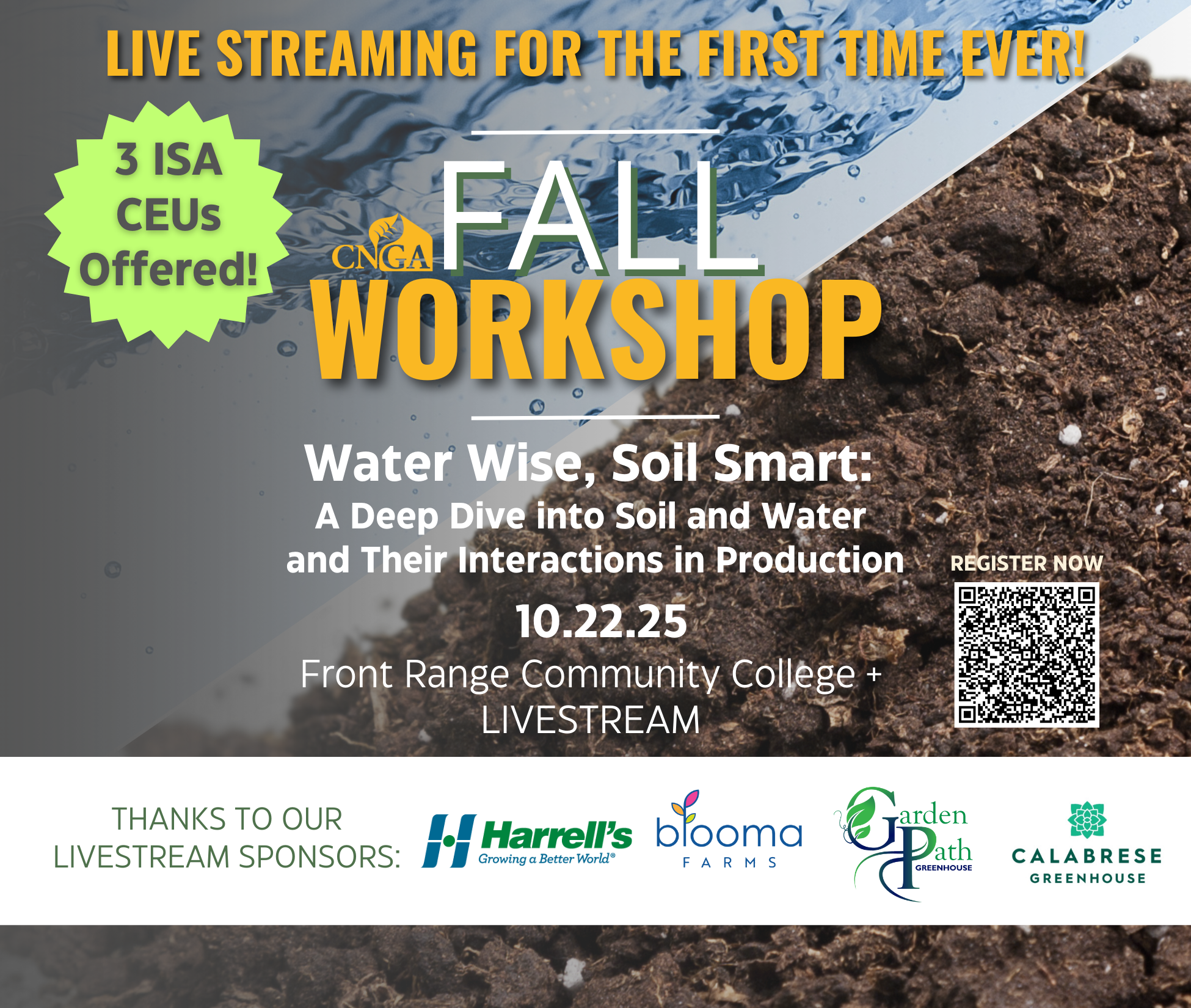 CNGA Fall Workshop | October 22, 2025, at Front Range Community College + LIVESTREAM. The workshop on 10/22 is all about soil and water in field and container production, offers 3 ISA CEUs and is available via livestream for the first time ever.